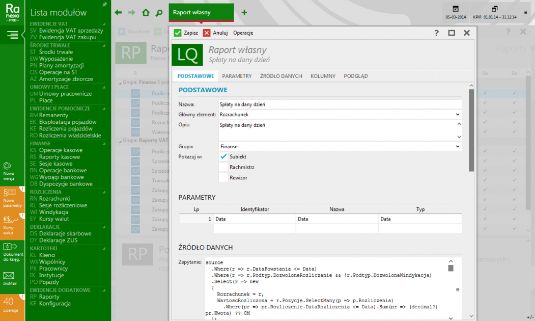 - definiowanie własnych raportów i wydruków z możliwością ich eksportu do innych programów InsERT nexo;