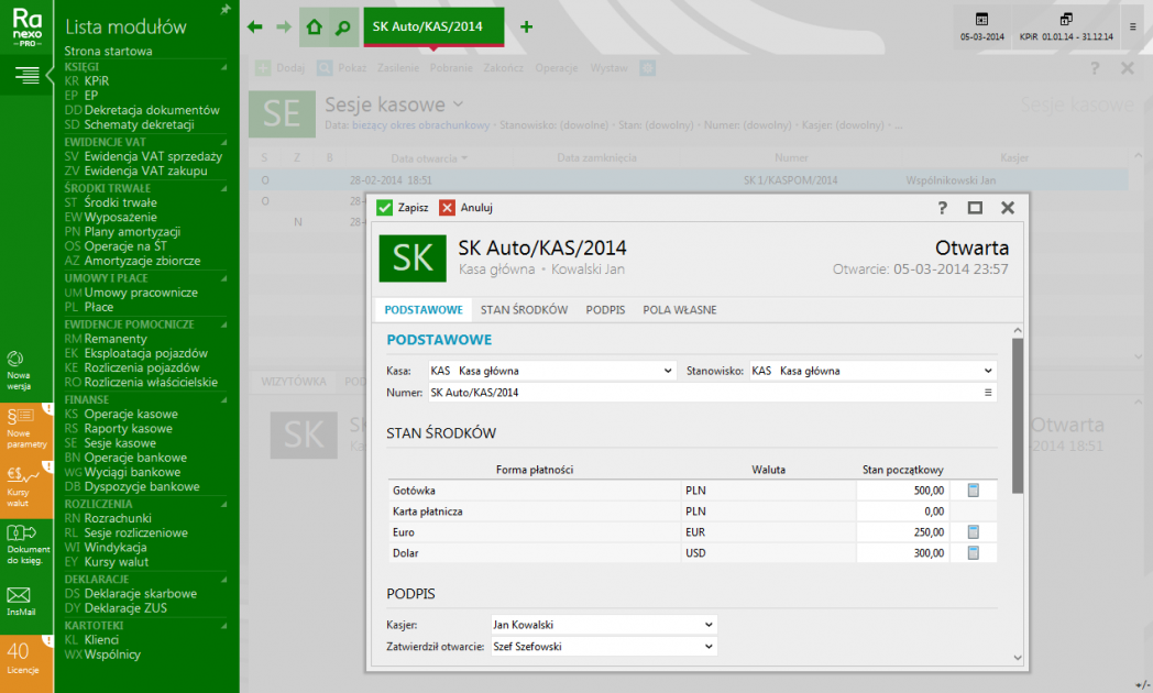 - Sesje kasowe umożliwiające kontrolę kasjera (w momencie zamykania sesji pogram sam wylicza, czy stan środków pieniężnych jest zgodny z operacjami zarejestrowanymi w systemie).