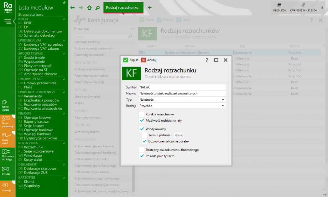 - definiowalne rodzaje rozrachunków;