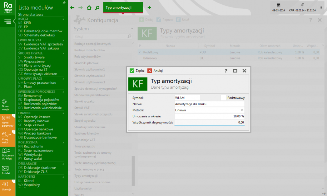 - Możliwość zdefiniowania własnych typów amortyzacji.