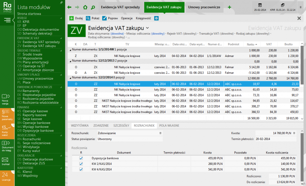 - ewidencja i rozliczanie rozrachunków, integracja z zapisami księgowymi KPiR bądź EP oraz z zapisami VAT;